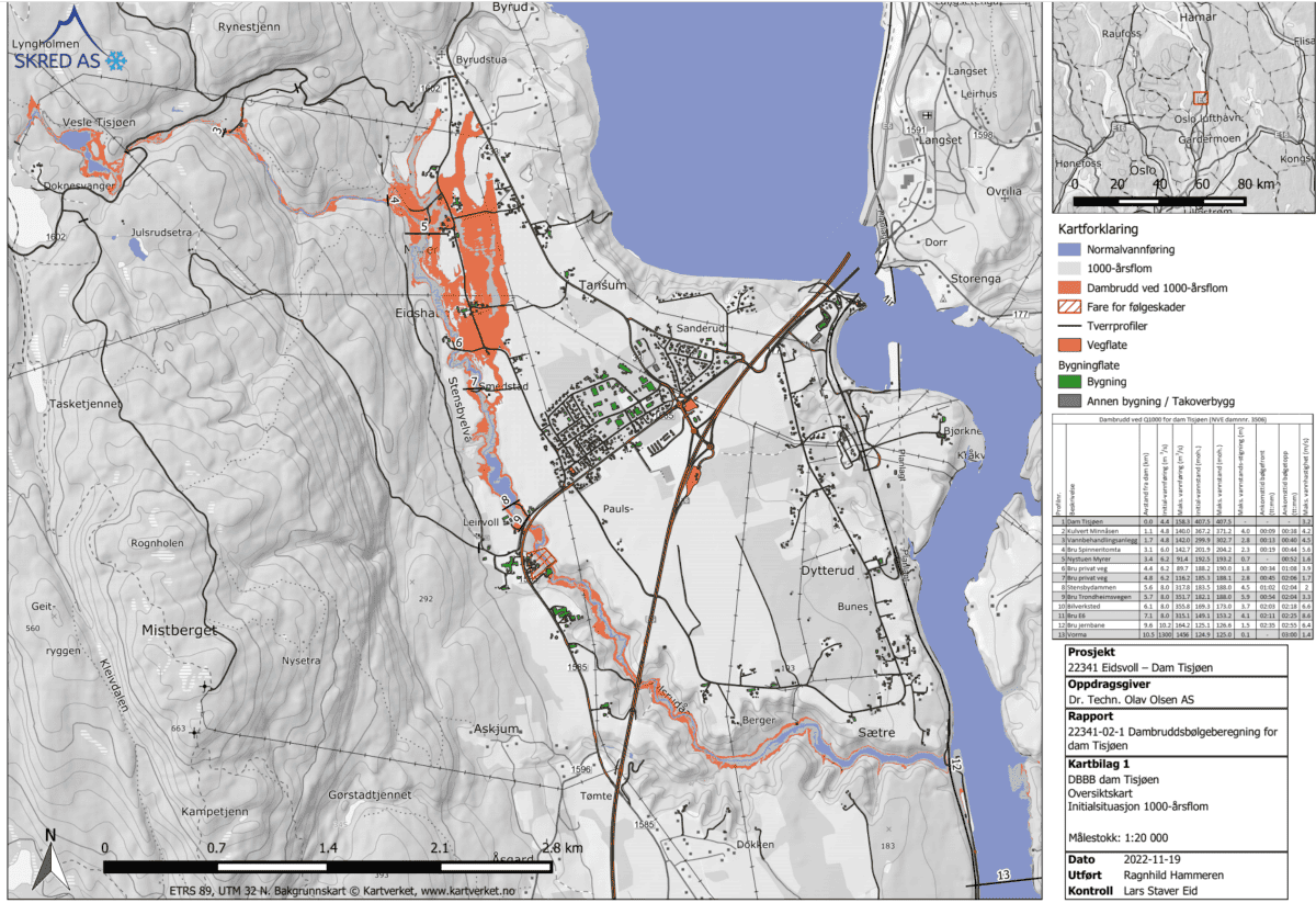 Som underleverandør til Dr. Techn. Olav Olsen på rammeavtalen med Øvre Romerike har Skred AS utført dambruddsbølgeberegninger for ny dam Tisjøen i Eidsvoll kommune. Opprinnelig er dam Tisjøen en murdam, men denne skal rives og ny dam Tisjøen bygges som gravitasjonsdam i betong. En bruddbølge fra dam Tisjøen følger Stensbyelva ned til samløpet med Vorma.