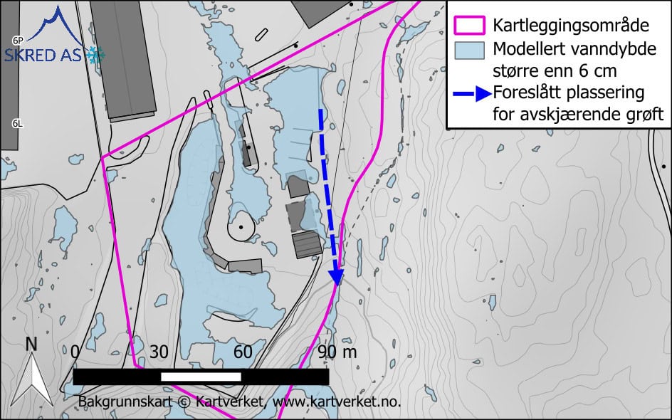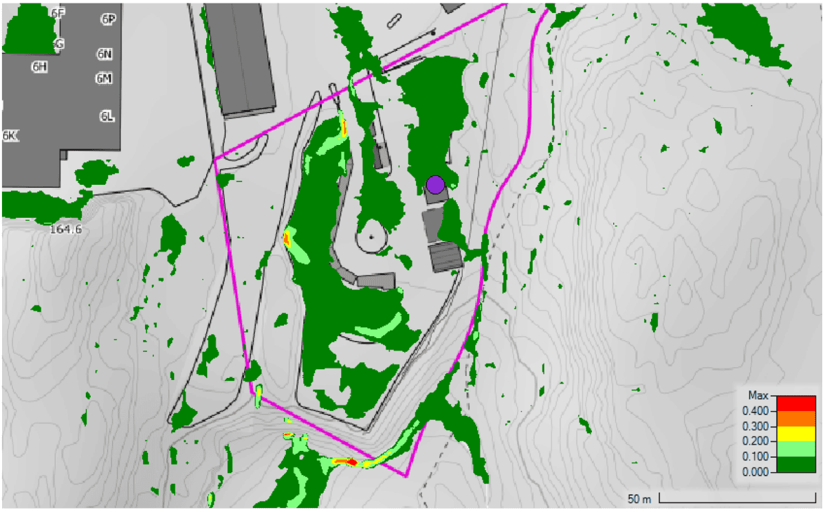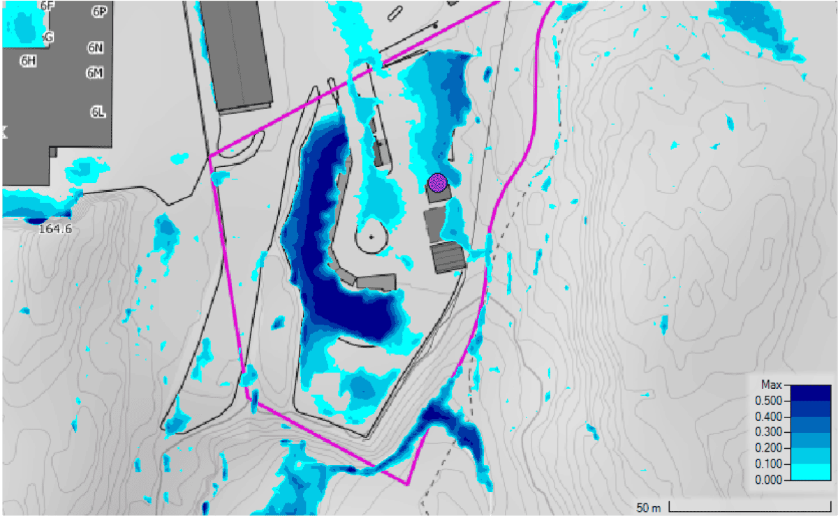 For å kartlegge faren fra overvann og identifisere mulige tiltak har vi satt opp en hydraulisk overflatemodell i HEC-RAS med et konstruert 100-årsnedbør etter anbefaling i NVEs veileder for kartlegging av fare fra overvann (2023). Dette gir oss informasjon om strømningsmønster under en nedbørhendelse og hvilke områder som er utsatt for enten store vanndybder eller store hastigheter, eller en kombinasjon av disse. Såkalte dybdeintegrerte hastighetsplott viser produketet av hastighet og dybde, hvor det er fastsatt ulike nivåer for hva som utgjør en fare for mennesker, framkommelighet og byggverk. Modelleringen viste at eksisterende bygg kunne være utsatt for overvann og det ble derfor anbefalt et nivå å legge nytt bygg på, samt en drenerende kanal i bakkant av gjenvinningsstasjonen for å avlede vann under en flomhendelse.