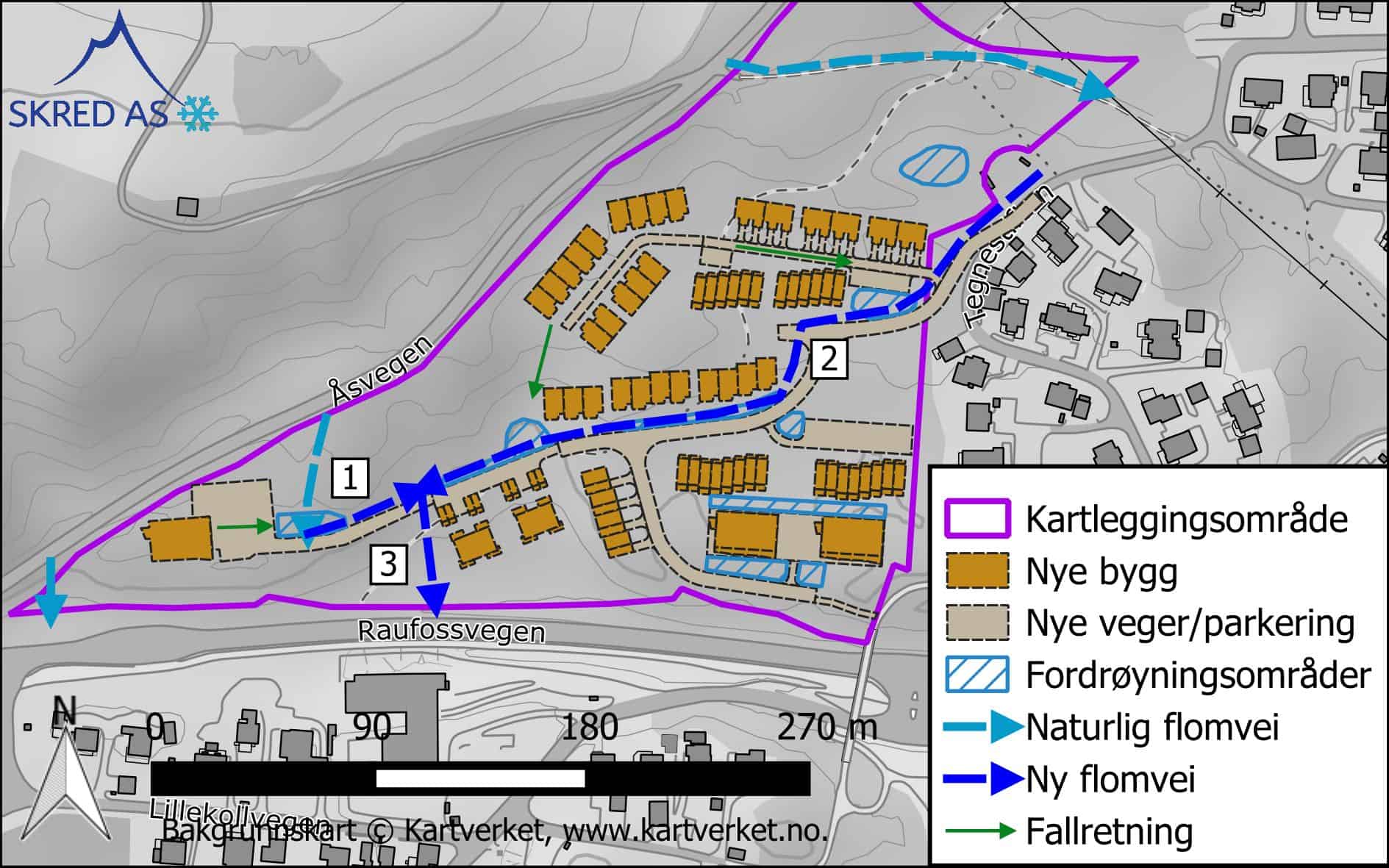 I overvannsplanen tas det høyde for gjennomgående flomveier. Nye interne flomveier er plassert i samråd med geolog for å unngå bratte områder der økte vannmengder potensielt kan gi økt skredfare i nedre del av planområdet. Beregning av behov for fordrøyning er gjort i henhold til retningslinjene til Gjøvik kommune og vi har anbefalt åpne, naturbaserte løsninger med flerfunksjonelle arealer som oppnår tilstrekkelig fordrøyningsvolum.
