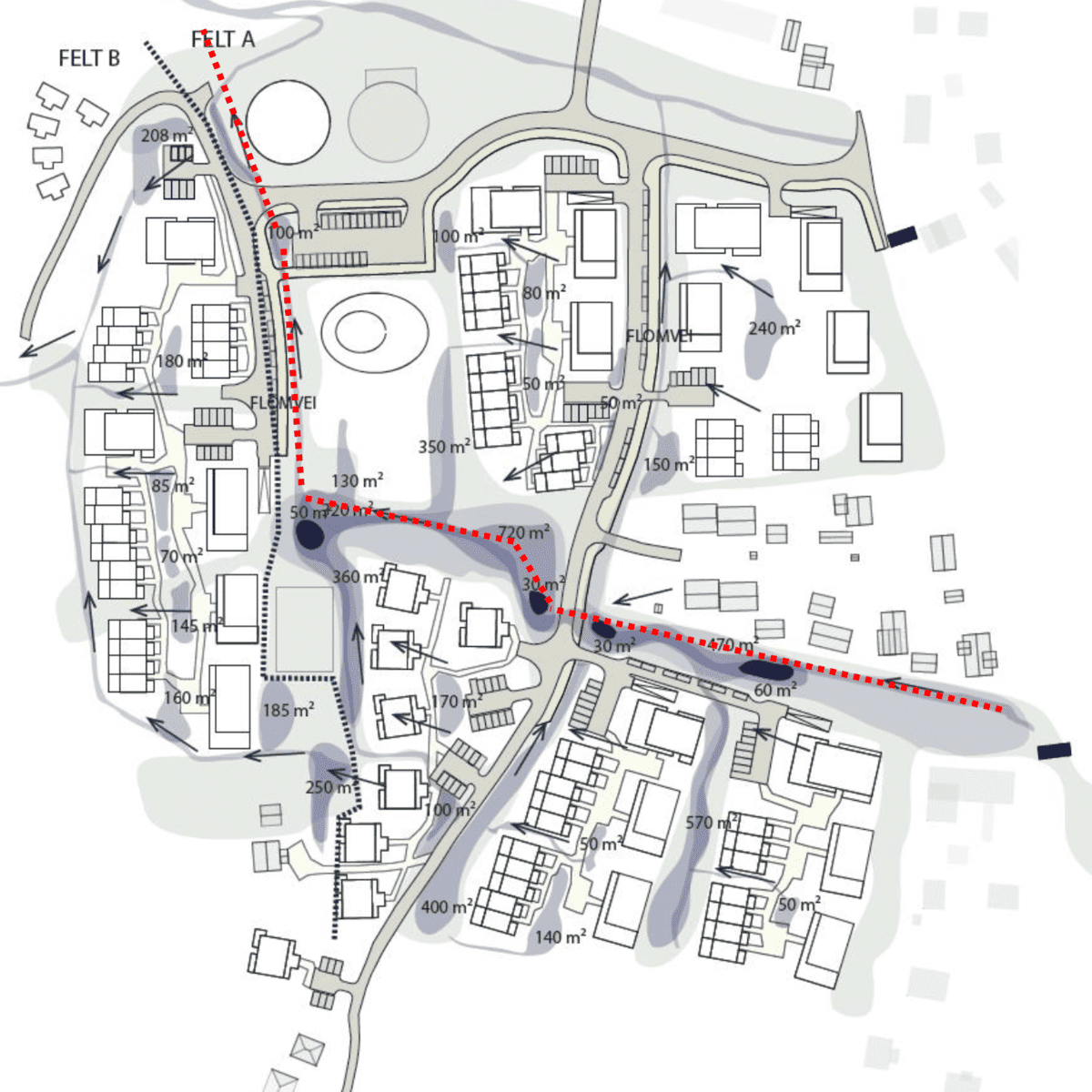 En helhetlig overvannsplan med løsninger for infiltrasjon, fordrøyning og flomveier er utformet i tett samarbeid med arealplanlegger og landskapsarkitekter, og benytter åpne, naturbaserte løsninger med flerfunksjonelle arealer.
