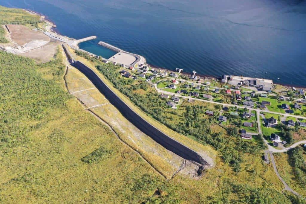 - Skredfaglig dimensjonering av fangvollen ovenfor deler av Fjordgård sentrum. Vollen er 14 m høy, og over 400 m lang.