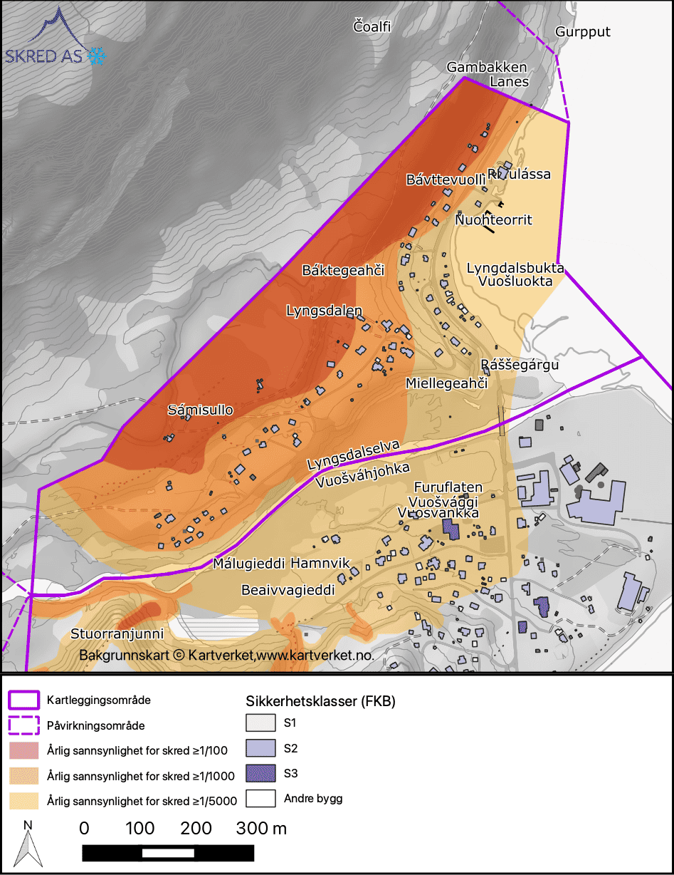 Vår leveranse var en skredfarekartlegging for utvalgte områder i Lyngen kommune, i henhold til nasjonale retningslinjer (NVE veileder «Sikkerhet mot skred i bratt terreng – Utredning av skredfare i reguleringsplan og byggesak»). Leveransen besto av faresoner for skred med årlig nominell sannsynlighet større enn 1/100, 1/1000 og 1/5000, og en rapport som beskriver grunnlaget for vurderingene. Faresonene er levert digitalt slik at de kan brukes til arealplanlegging og beredskapssituasjoner. Leveransen avdekket at en god del bebyggelse lå utsatt for skred, spesielt for snøskred, men også stedvis for flomskred. Basert på våre faresoner har kommunen og andre et bedre grunnlag for å vite hvilken bebyggelse som er mest utsatt. Dette vil også være nyttig i værsituasjoner med høy skredfare.
