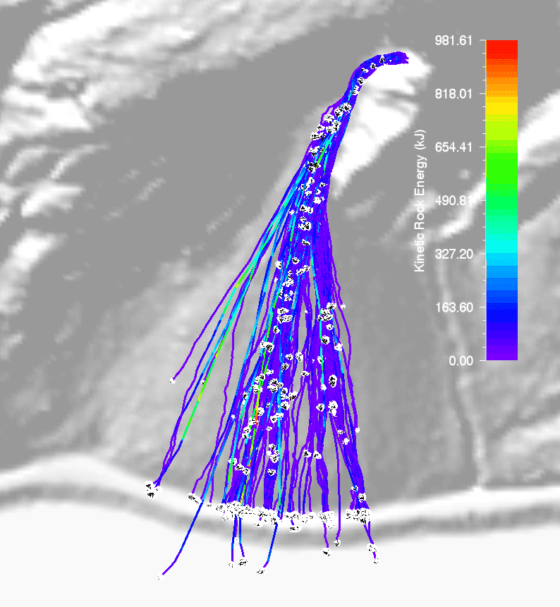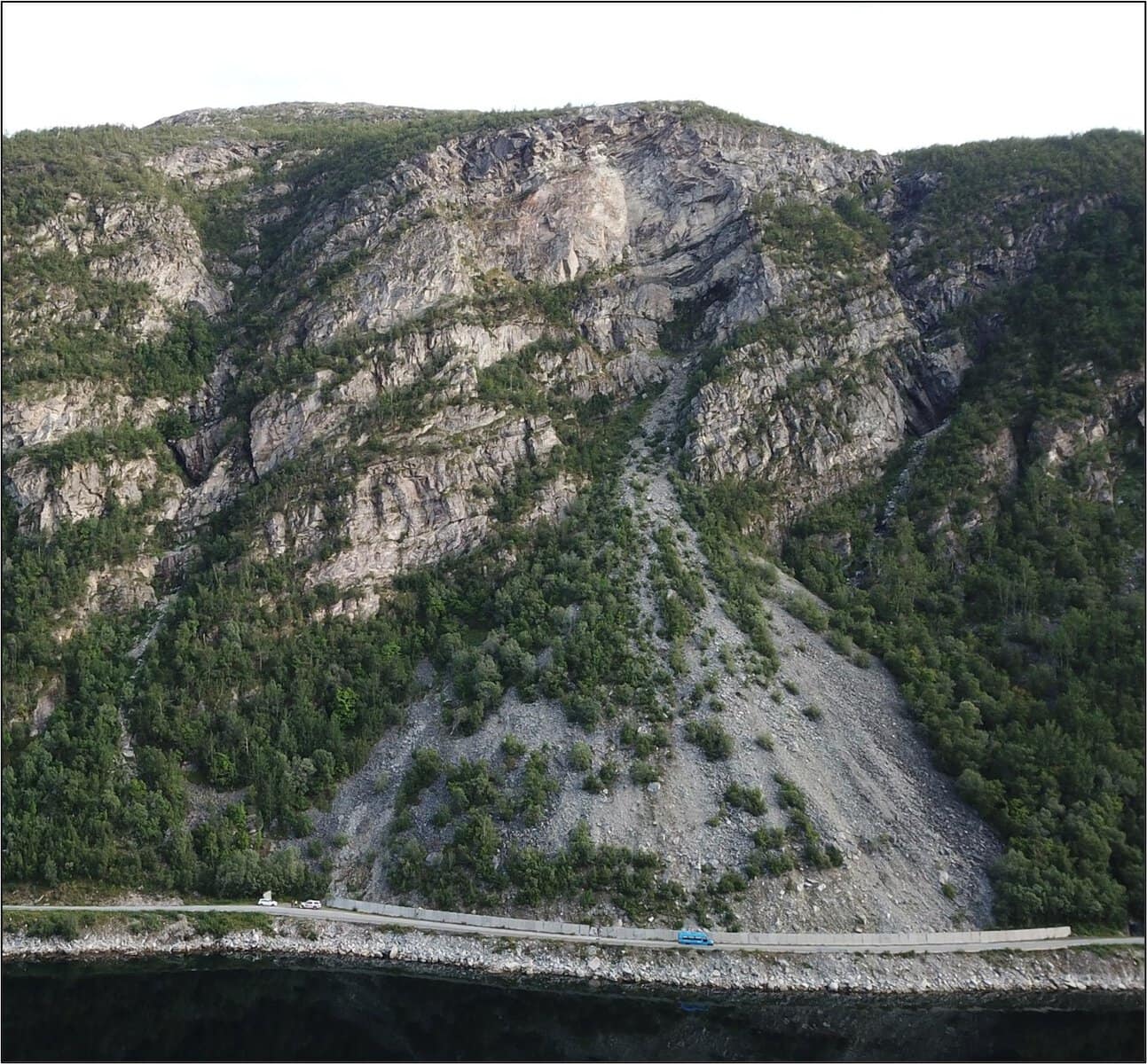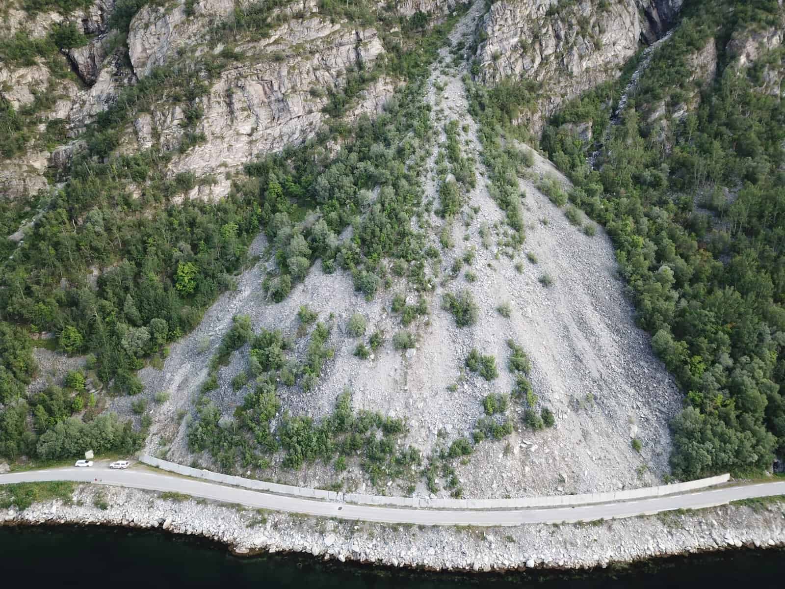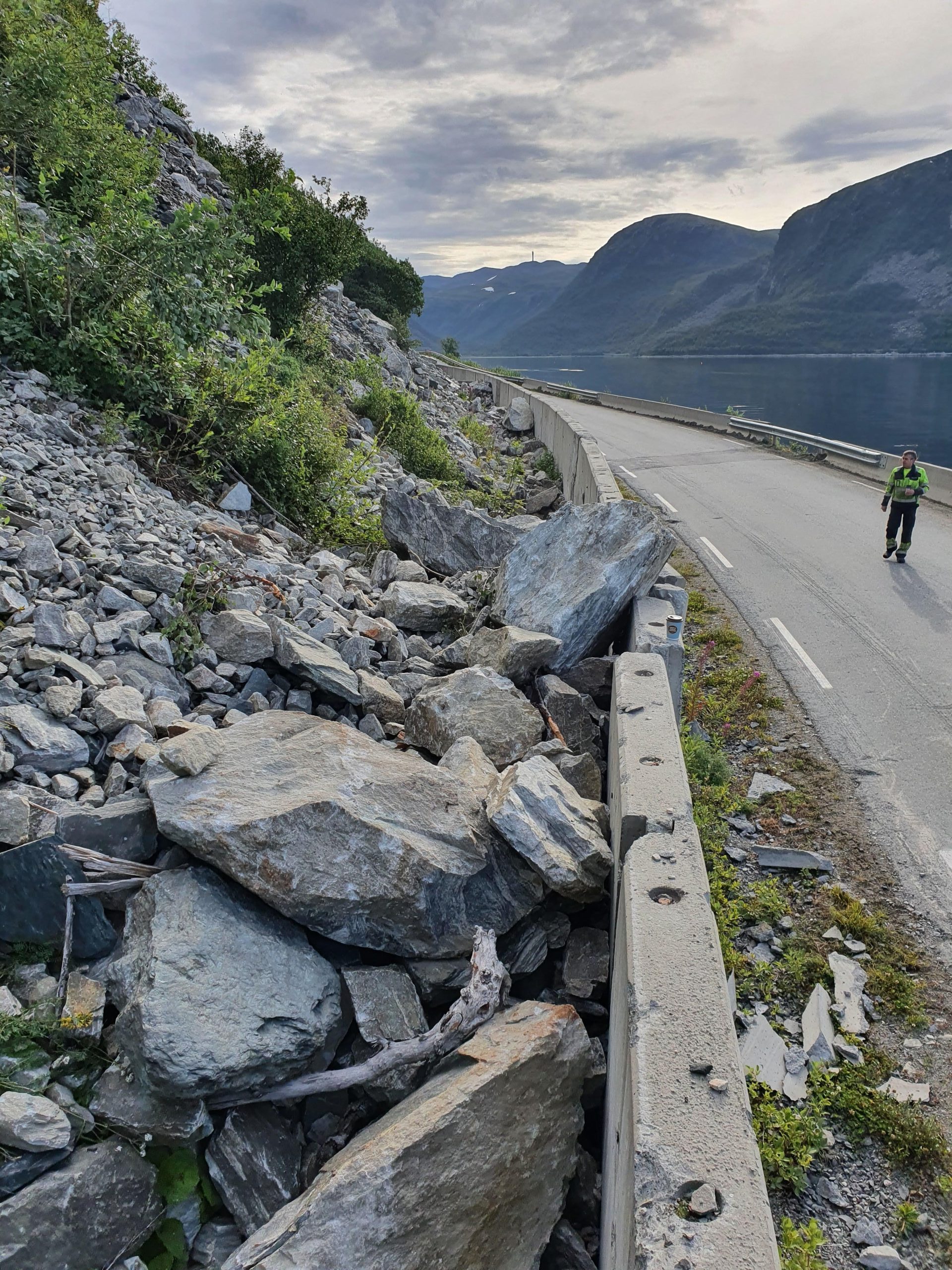 Vi var på befaring etter steinskredhendelsen, hvor vi dokumenterte løsneområdet og utløpet. I akuttfasen vurderte vi umiddelbar fare for nye hendelser. Betongmuren ble skadet, og anbefalt reetablert i påvente av permanente sikringstiltak. Vi tilbakeregnet hendelsen med RAMMS:Rockfall og sammenliknet resultatene med observerte skader på betongmuren.